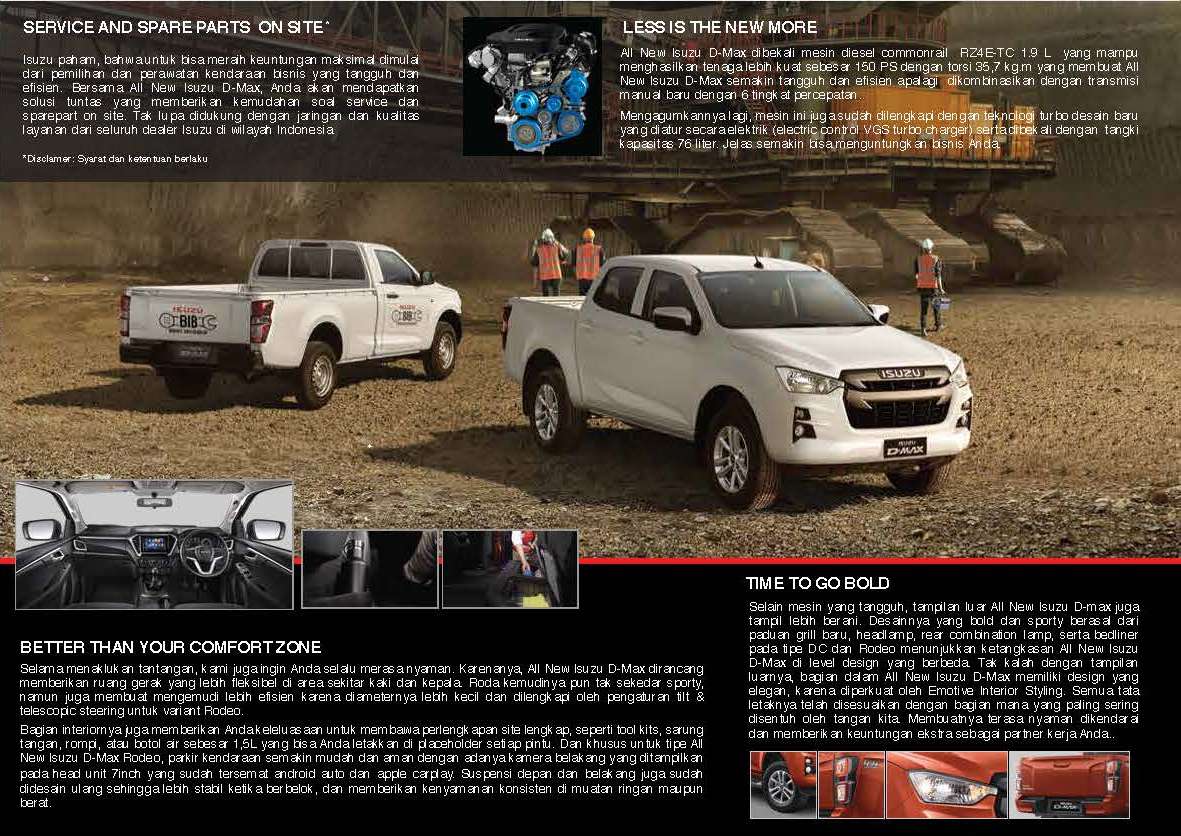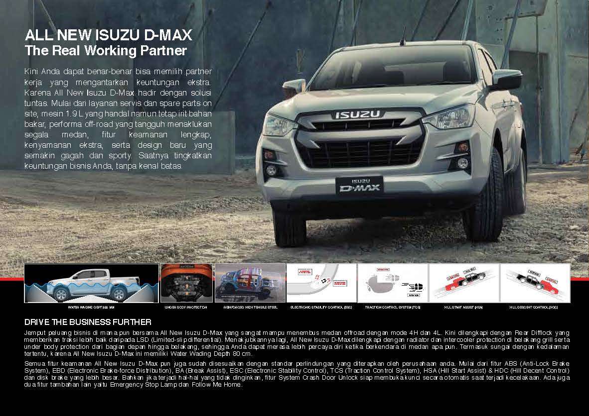 All New Isuzu D-Max hadir dengan solusi tuntas, desain eksterior yang sangat dinamis, tangguh dan sporty dengan adanya LED head lamp, serta tampilan shaping style. Mesin 1.9 L yang handal namun tetap irit bahan bakar, performa off-road yang tangguh menaklukan segala medan, fitur keamanan lengkap, kenyamanan ekstra, serta design baru yang semakin gagah dan sporty. Saatnya tingkatkan keuntungan bisnis Anda, tanpa kenal batas.