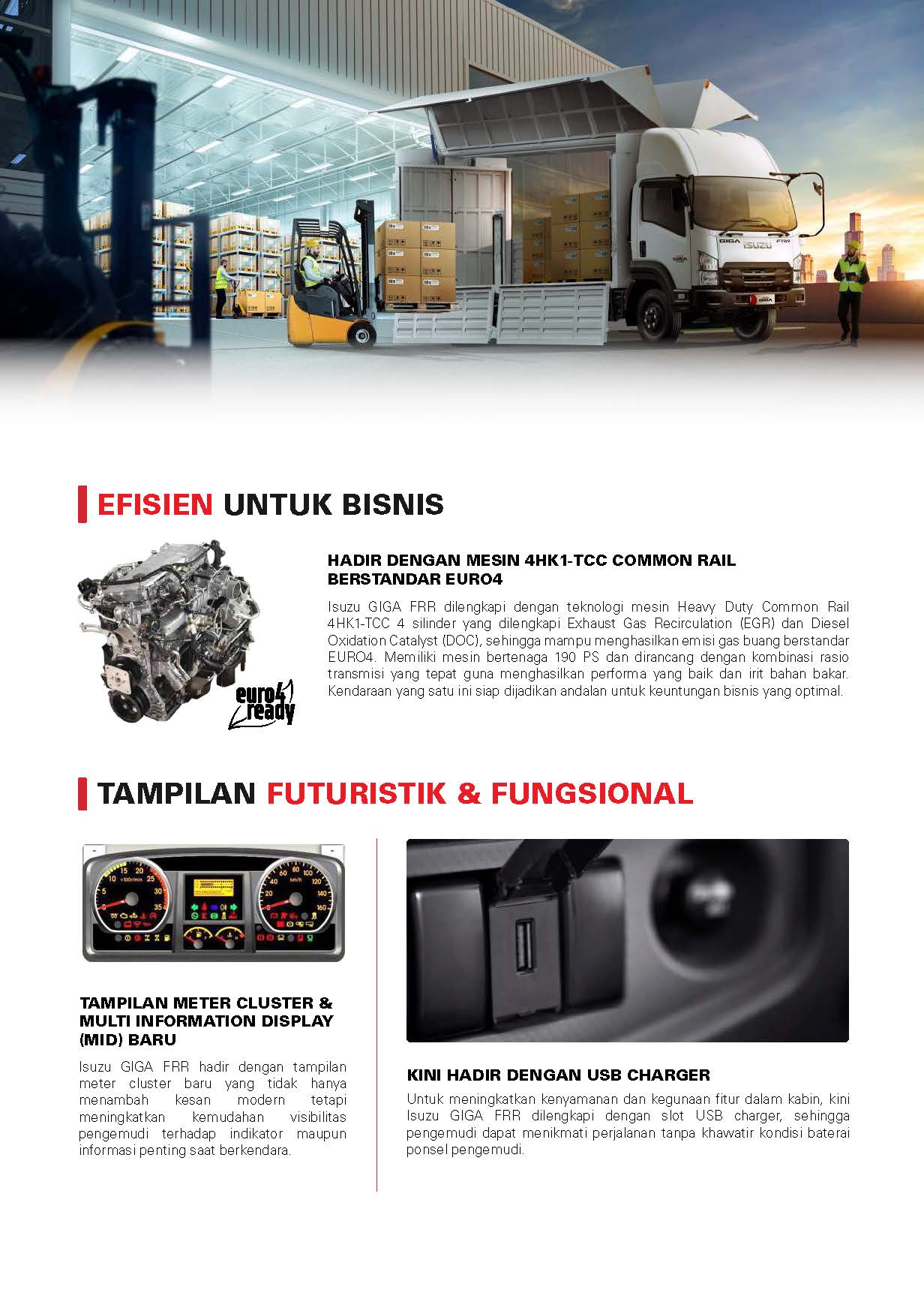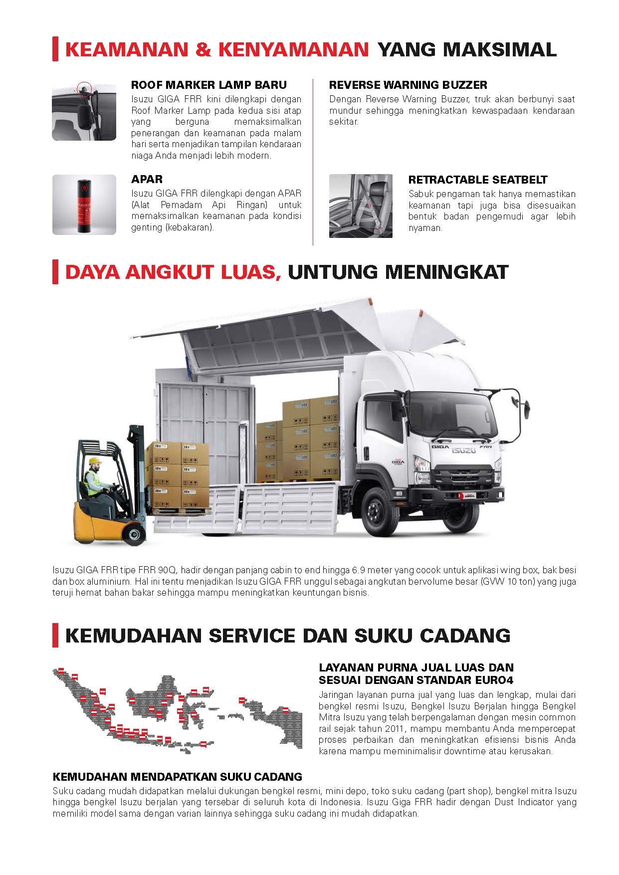 Isuzu FRR adalah kelas awal dari varian GIGA yang sudah menggunakan mesin common rail, tapi masih menggunakan 4 cylinder supaya kendaraan tetap irit. Cocok dipakai untuk muatan bervolume, dengan berat total kendaraan 10 ton yang bisa diaplikasikan sebagai wing box dan aluminium box.